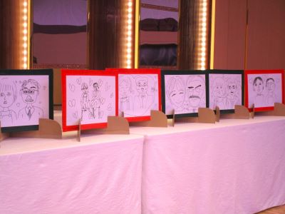 続いては毎年お楽しみの一つ、余興の開始です。今年はテーブル対応お絵かき合戦と称して、理事長と理事長補佐をモデルに各テーブル一人1分の持ち時間で似顔絵を描いていくものです。絵心のある方からスタートするのが定石、担当スタッフの期待を裏切る程の上手な出来栄え??にビックリです。