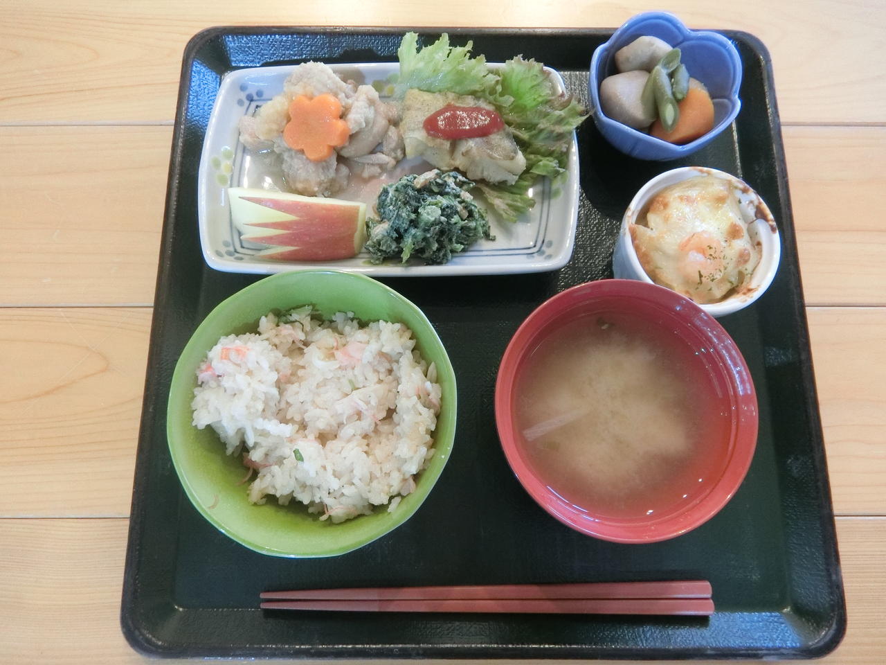 エビが乗った香ばしいグラタンや切り方がかわいいリンゴもデザートにありました。季節のメニューではかにめし風ご飯も・・・000